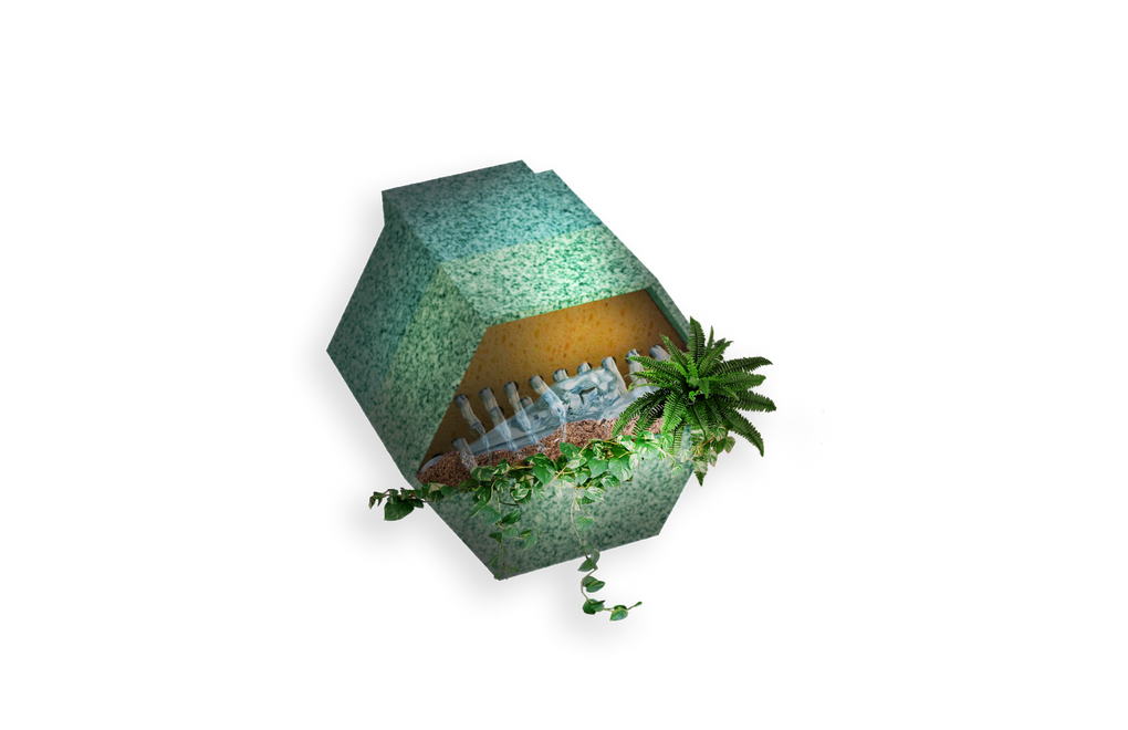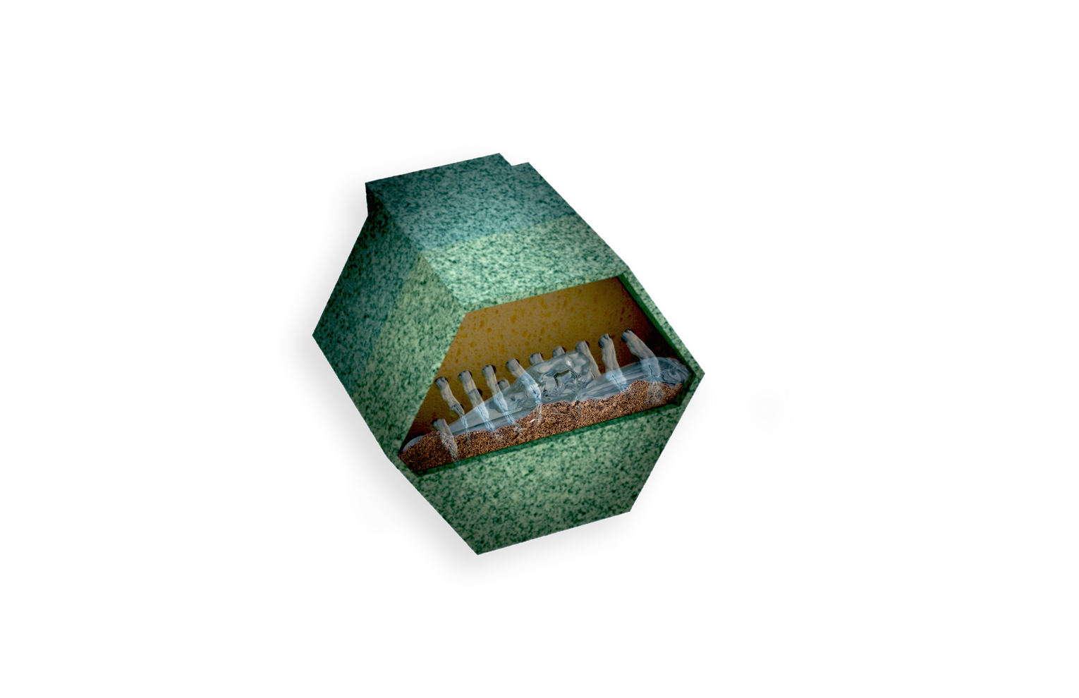 Our research delves into regenerative agriculture practices in Jalisco, Mexico, seeing it as a key source for biomaterial production. Envisioning a future with 'truly regenerative materials,' we explore how biomaterials replacing plastics can support regenerative agriculture by reducing carbon, ensuring food security, and strengthening natural ecosystems. Our product is a 3D mold for cultivating mycelium seedbeds, containing auxins, plant hormones enhancing growth and that are biodegradable and support the soil as fertilizer. This fortified the plant, reducing susceptibility to diseases caused by parasites or bacteria. It justifies the added value of the mycelium's price, offering a biodegradable solution that integrates naturally into the soil, fortifying the plant—a systemic design approach.