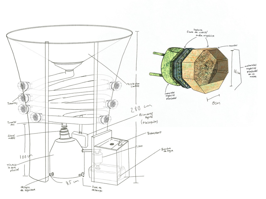 Because Guadalajara, Mexico, is one of the states with the highest rainfall, being the wettest season lasts 3.7 months, from June 8th to September 30th, with over a 40% probability of a day being wet. We decided to create 7622m2 green adobe walls housing endemic plants, placed in parks and avenues across the city, featuring a rainwater harvesting system that stores up to 2,500 liters. This tank can be filled approximately 13 times per year and stored in free water fountains, leading to an average saving of 4,000 pesos annually in water access costs, equivalent to roughly one month of their family income.